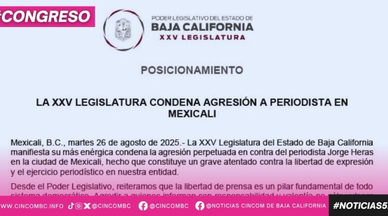Leer másMexicali, B.C., martes 26 de agosto de 2025.- La XXV Legislatura del Estado de Baja California manifiesta su más enérgica
