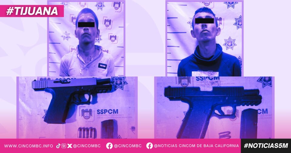 Tijuana, Baja California, a 30 de noviembre de 2025. Agentes de la Secretaría de Seguridad y Protección Ciudadana Municipal aseguraron a dos individuos armados, considerados objetivos del Distrito Sánchez Taboada y generadores de violencia, luego de una oportuna y eficaz intervención.