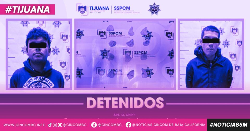 Tijuana, Baja California, a 21 de abril de 2026. La Secretaría de Seguridad y Protección Ciudadana Municipal (SSPCM) informó que, durante la madrugada de este martes 21 de abril, se detuvo a dos personas en posesión de 12 envoltorios con una sustancia con características similares a la droga conocida como cristal; además, presuntamente están vinculadas con robos a tres tiendas OXXO.