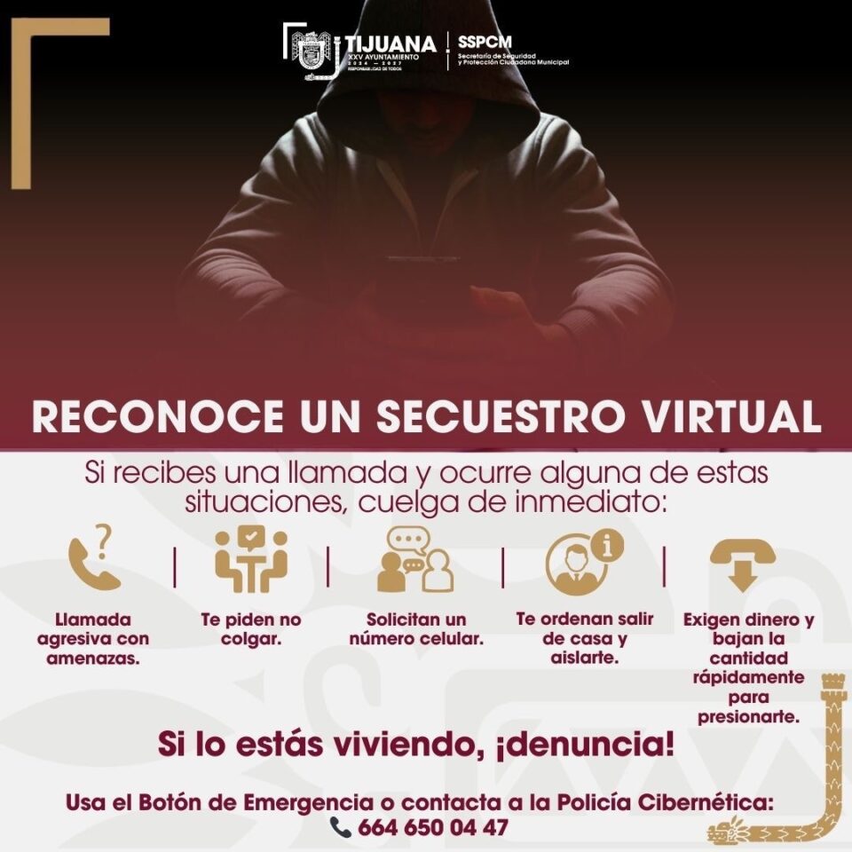Tijuana, Baja California, a 17 de agosto de 2025.- La Secretaría de Seguridad y Protección Ciudadana Municipal, a través de la Policía Cibernética y la Célula de Búsqueda de Personas, exhorta a la ciudadanía a mantenerse alerta y no caer en engaños conocidos como “secuestros virtuales”, una modalidad de extorsión telefónica en la que los delincuentes buscan manipular y aislar a sus víctimas para obtener dinero sin tener contacto físico con ellas.