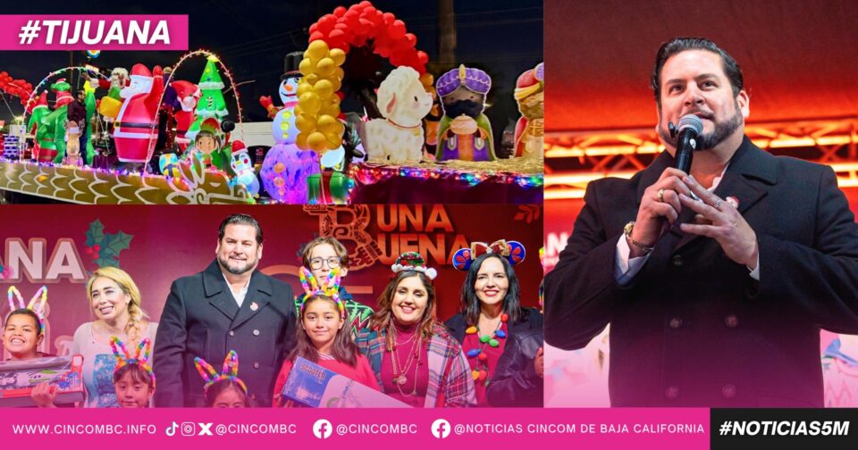 Tijuana, Baja California, a 20 de diciembre de 2025. Más de 5 mil tijuanenses presenciaron el paso de la Caravana Navideña, encabezada por el presidente municipal, Ismael Burgueño Ruiz, que dio inicio alrededor de las 17:00 horas desde la estación Insurgentes del SITT, como parte de las celebraciones organizadas por el Gobierno Municipal, para llevar un mensaje de unidad y espíritu festivo a las familias durante esta época del año.