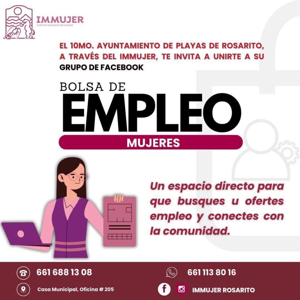 El 10° Ayuntamiento de Playas de Rosarito, a través del Instituto Municipal de la Mujer (IMMUJER), invita a las mujeres rosaritenses a integrarse al grupo de Facebook “Bolsa de Empleo Mujeres”, un espacio digital creado para facilitar la búsqueda y oferta de empleo, así como fortalecer la vinculación con la comunidad.