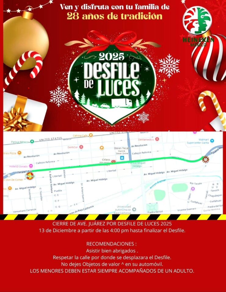 Tecate, Baja California a 11 de diciembre de 2025.– El Gobierno de Tecate informa a la ciudadanía que, con motivo del tradicional Desfile de Luces 2025, se realizará el cierre total de la Avenida Benito Juárez, desde la calle Esteban Cantú hasta la calle Río Lerma, a la altura de la Central de Bomberos, este sábado 13 de diciembre a partir de las 4:00 de la tarde, permaneciendo restringido el acceso vehicular hasta la conclusión del evento.