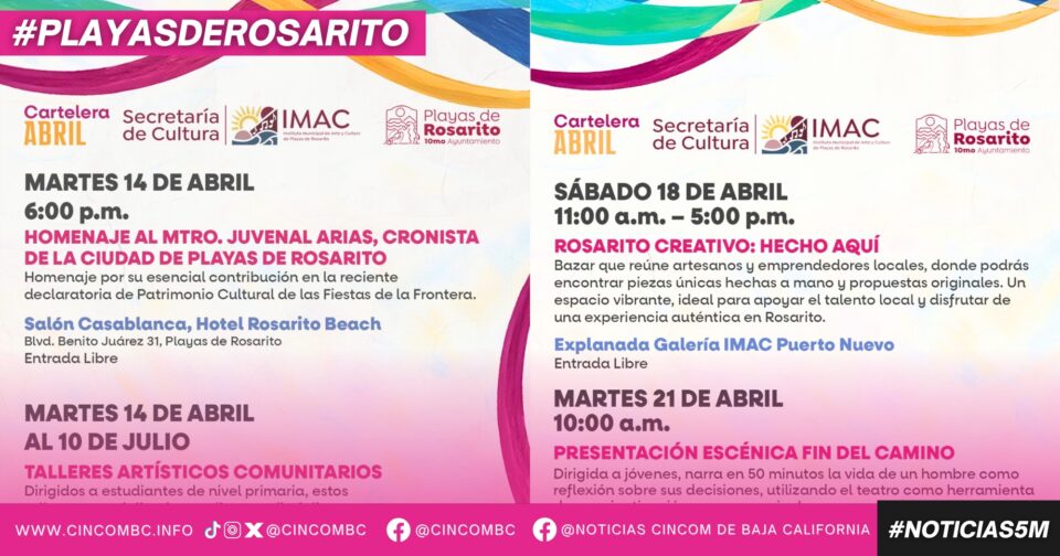 La cartelera también contempla talleres artísticos comunitarios dirigidos a estudiantes de nivel primaria, una feria cultural familiar en el Centro Comunitario de Rancho 40, el bazar “Rosarito Creativo: Hecho Aquí”, así como presentaciones escénicas con enfoque de concientización social dirigidas a jóvenes.