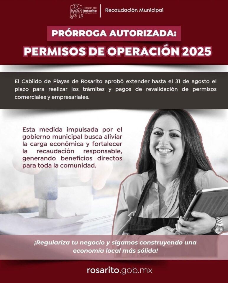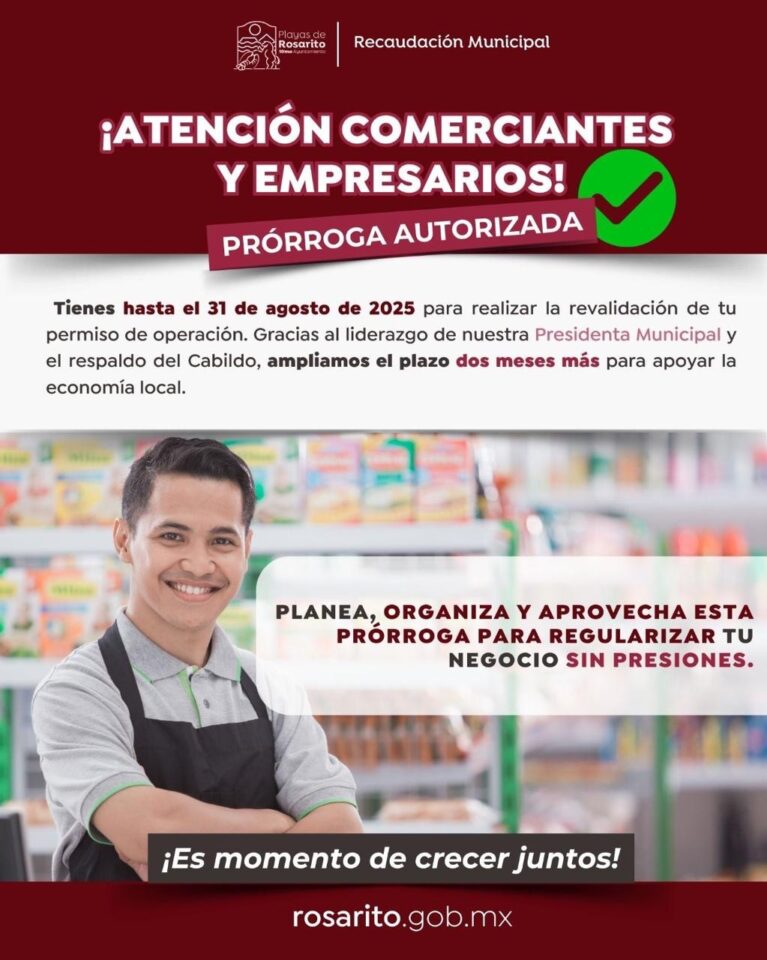 Esta medida busca aliviar la carga financiera que actualmente enfrentan muchos empresarios, permitiéndoles mantener sus operaciones en regla y contribuir al dinamismo de la economía de Rosarito. Durante este periodo adicional, los comerciantes podrán organizar mejor sus finanzas y cumplir sin presiones con sus obligaciones administrativas.