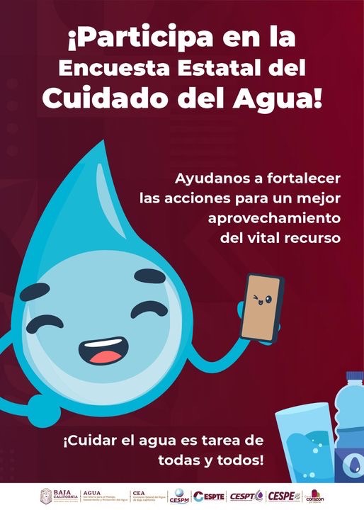 MEXICALI.- Con el objetivo de fortalecer las estrategias para aprovechar correcta y eficientemente el vital líquido, la Secretaría para el Manejo, Saneamiento y Protección del Agua (SEPROA) y la Comisión Estatal del Agua (CEA) invitan los bajacalifornianos a participar en la Encuesta Estatal del Cuidado del Agua.
