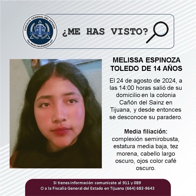 TIJUANA, B.C., 29 DE AGOSTO DE 2024 La Fiscalía General del Estado (FGE), solicita el apoyo de la ciudadanía para localizar a Melissa Espinoza Toledo de 14 años de edad.