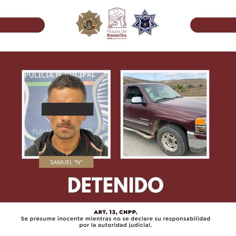 Playas de Rosarito, Baja California, 17 de julio de 2025.– El 10° Ayuntamiento de Playas de Rosarito, a través de la Secretaría de Seguridad Ciudadana, informa que durante un operativo de vigilancia preventiva, elementos de la Policía Municipal realizaron la intervención oportuna de un vehículo tipo pick-up en el camino vecinal que conduce a la Colonia Real de Rosarito, lo que derivó en la detención de un sujeto con orden de aprehensión vigente y la recuperación de una unidad con pre denuncia de robo.