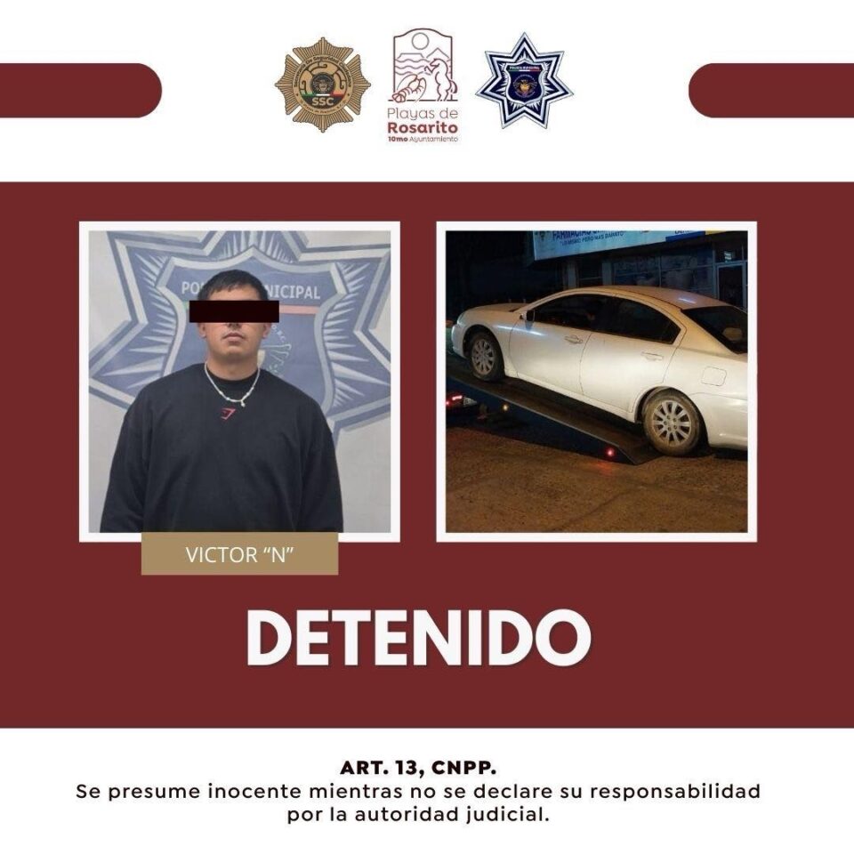 Playas de Rosarito, Baja California, 18 de agosto de 2025.– El Ayuntamiento de Playas de Rosarito, encabezado por la presidenta municipal Mtra. Rocio Adame, a través de la Secretaría de Seguridad Ciudadana a cargo del Lic. Héctor Manzo Ruvalcaba, informa sobre la detención de un individuo y el aseguramiento de un vehículo con reporte de robo.