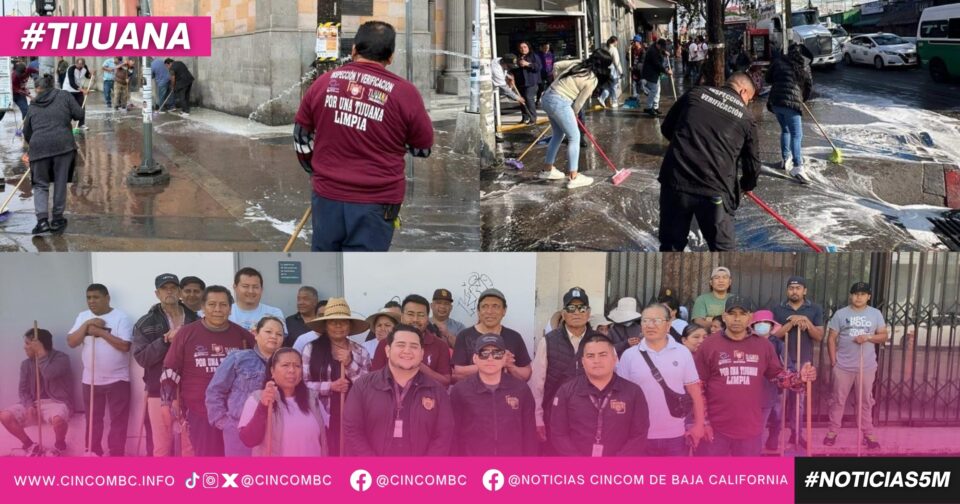 Tijuana, Baja California, a 25 de marzo de 2026. El gobierno del presidente municipal, Ismael Burgueño Ruiz, a través de la Dirección de Inspección y Verificación, llevó a cabo una jornada de limpieza en el primer cuadro de la ciudad, en coordinación con comerciantes de la Asociación Tijuana Zona Centro, con el objetivo de mejorar la imagen urbana y el orden en el municipio.