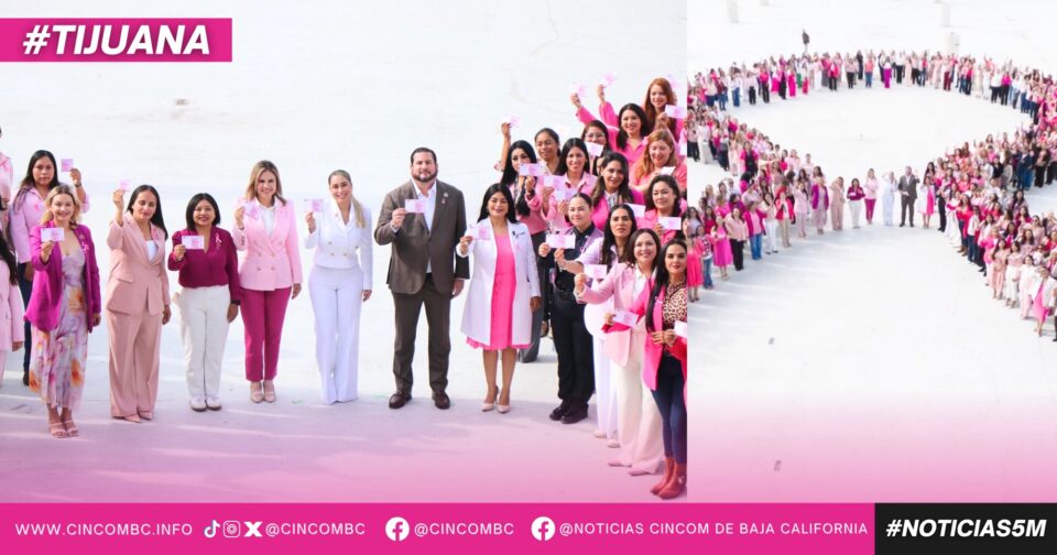 Tijuana, Baja California, a 21 de octubre de 2025. Como parte de las acciones de sensibilización en la lucha contra el cáncer de mama, este martes, el presidente municipal de Tijuana, Ismael Burgueño Ruiz, junto a las mujeres que conforman el XXV Ayuntamiento de Tijuana, formaron un listón rosa para la toma de una fotografía simbólica, como muestra de unión, esperanza y compromiso en favor de la salud preventiva.