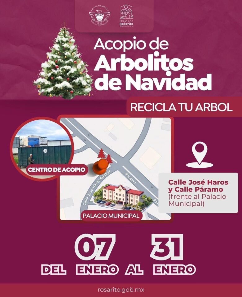 Al respecto, la Dirección de Servicios Urbanos informó que, por instrucciones de la presidenta municipal de Playas de Rosarito, Rocío Adame, se designó este espacio como centro oficial de acopio, con el fin de evitar que los árboles naturales sean arrojados en la vía pública, lotes baldíos o zonas naturales.