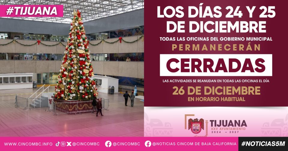 Tijuana, Baja California, a 23 de diciembre de 2025. El gobierno del presidente municipal, Ismael Burgueño Ruiz, informa que los próximos días miércoles 24 y jueves 25 de diciembre, serán días inhábiles para el personal que labora en el XXV Ayuntamiento de Tijuana, por lo que todas las oficinas en Palacio Municipal, delegaciones y dependencias paramunicipales, permanecerán cerradas a la atención al público.