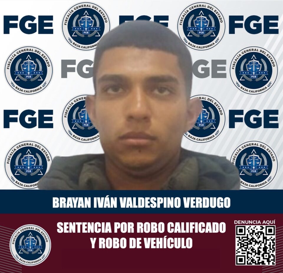 TIJUANA, BAJA CALIFORNIA, A 16 DE SEPTIEMBRE DE 2024.- La Fiscalía Regional de Tijuana, tras la presentación de pruebas y una efectiva investigación, obtuvo una sentencia de 10 años de cárcel contra Brayan Iván Valdespino Verdugo, culpable de robo calificado a lugar cerrado ejecutado con violencia y robo de vehículo con violencia.