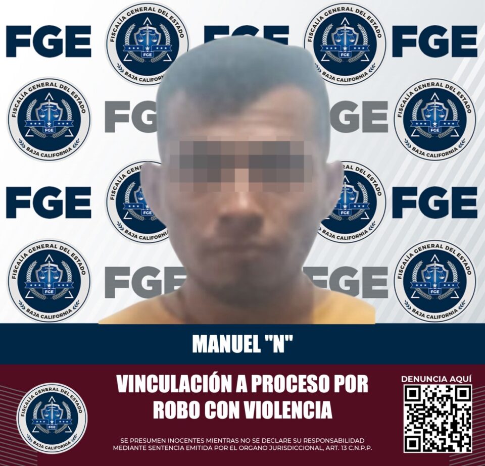 TIJUANA, BAJA CALIFORNIA A 18 DE SEPTIEMBRE DE 2024. – Gracias al trabajo realizado por la Unidad de Investigación con Detenido, la Fiscalía Regional de Tijuana, obtuvo la vinculación a proceso por el delito de robo calificado con violencia en contra de un sujeto relacionado en un atraco cometido el día 6 de septiembre del presente año.